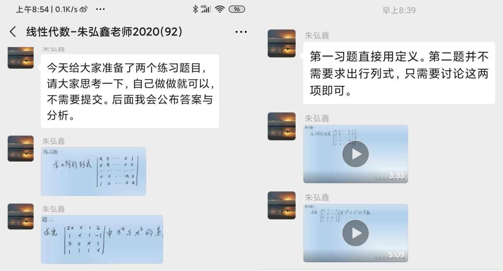 朱弘鑫老师任教的《线性代数》在微信群答疑时,通过手写拍照上传图片方式发布课程小作业,然后利用文字和小视频结合方式进行充分讲解,这些小视频用Surface手写PPT录屏制作,每个3-5分钟,约5M大小,微信群里发送方便,讲解清楚。