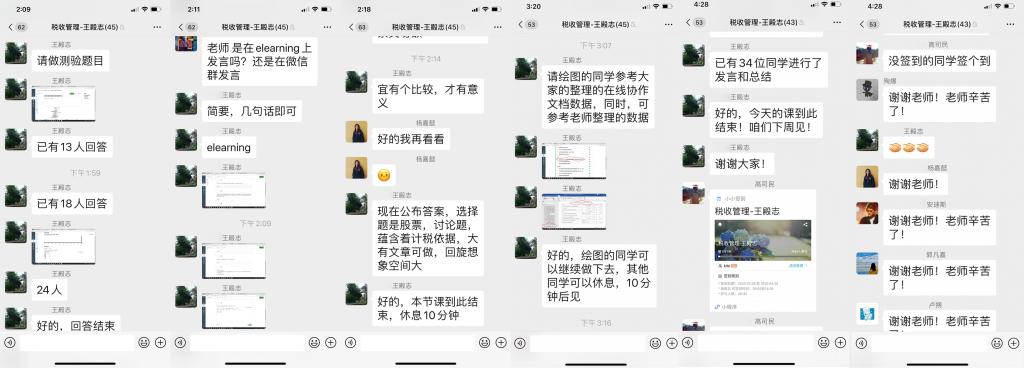 王殿志老师本周开设了《国家预算》和《税收管理》两门课,他通过微信群和elearning系统相结合的方式进行教学互动,课前在elearning系统发布阅读材料和作业题,然后按照教学步骤,在微信群与学生提问互动,并当场在elearning系统做课堂测验,然后在微信群进行讲解点评。