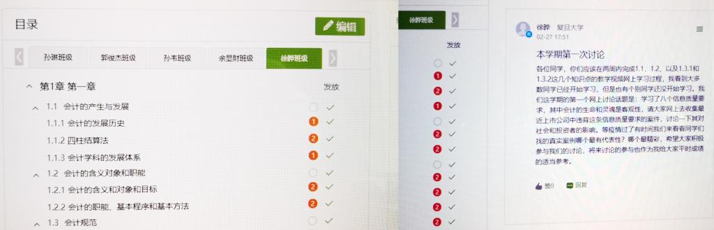 具体方式是,每个平行班的学生名单都导入到徐晔老师在学习通的课程中,徐晔老师把学习进度和计划等发至教学团队微信群,各位老师再统一发给所在班级学生。教学团队会定期开设电话会议,报告各班学生学习情况,如果老师需要自己班级学生的学习情况,由徐晔老师从系统里导出来发给大家。学习通有签到、讨论和督学等功能和学生学习数据导出功能。教学团队定期在学习通讨论板块发起讨论,组织所有同学参加,还通过学习通群聊和私发消息功能,随时随地回答学生提问。《会计学》课程进行的团队合作,确保了网上教学质量,而且学习方式灵活,学习效果不减。《会计学》课程本周已经开设两次。