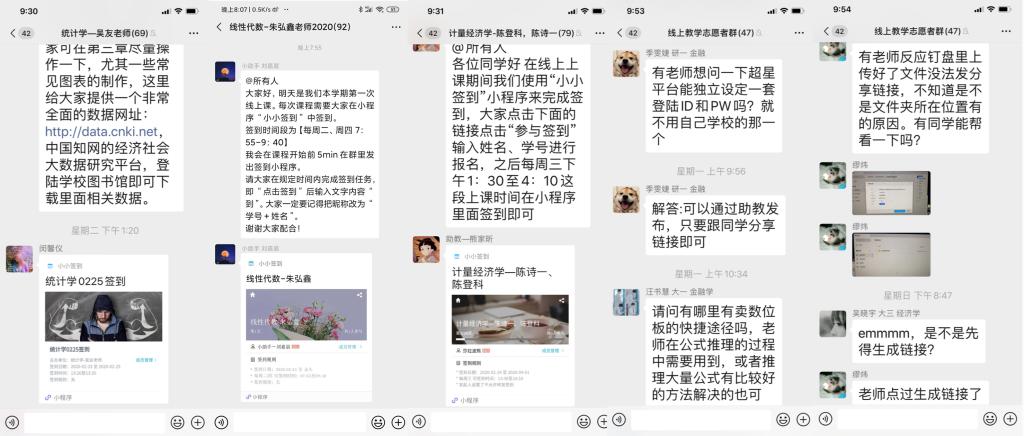 徐雷副校长在《复旦大学2020年春季学期本科教学安排调整通知解读》中强调“网络教学不是课程教学的网上直播”,复旦大学疫情期间的网络教学以“录播课为主,不推荐直播课”。这样的网络教学模式除了讲课视频和教学资料需要老师提前精心准备并上传之外,按照课表时间与学生进行的互动答疑尤为重要。互动答疑除了运用会议平台之外,运用最多的就是微信群。老师根据课程特点尝试在微信群采用多种多样的手段进行答疑。