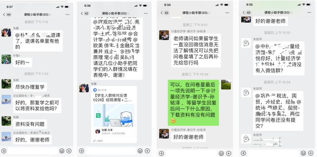 每堂课前5-10分钟,课程小助手会在所负责的课程微信群里发起微信“小小签到”程序,通知同学签到。在课程结束之后,小助手则一一清点签到人数,核实未签到原因,并及时反馈给本科教务办,同时还要向本科教务办提交课堂情况反馈。小助手像一个个小护卫,负责维护课程微信群的秩序和安全。