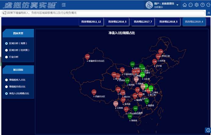 本系统已应用于我院本科生财政学课程的教学中,其核心功能在于对不同税制模式下我国增值税收入和负担省域分布和转移情况的可视化仿真模拟。学生可通过实验加深对税收转嫁与归宿、增值税制度与改革,以及政府间分税规则等重要财政学知识点的理解,并在对我国增值税制改革的政策效应开展多维度模拟分析的过程中提升研究和创新能力。