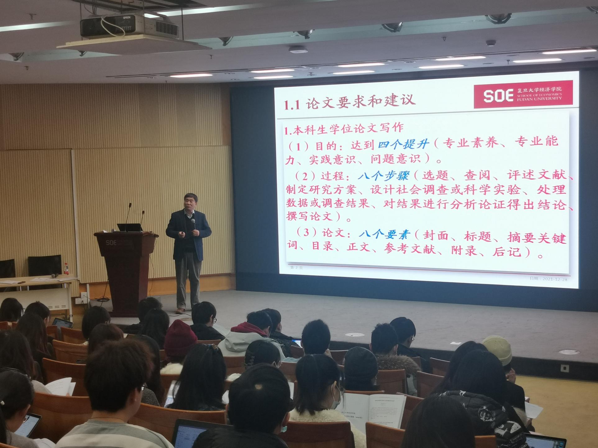 田素华教授通过列举十九届三中全会中和中央经济工作会议中的重要经济问题,引导同学们从当今现实问题入手,用经济学思维分析问题、用经济学方法解决问题,并进行经济学理论的创新性思考。又通过列举几篇我院教师在顶级期刊上发表的论文和往届本科毕业生优秀论文向同学们讲述了高水平学术论文如何做到“立足实践,聚焦前沿”。
