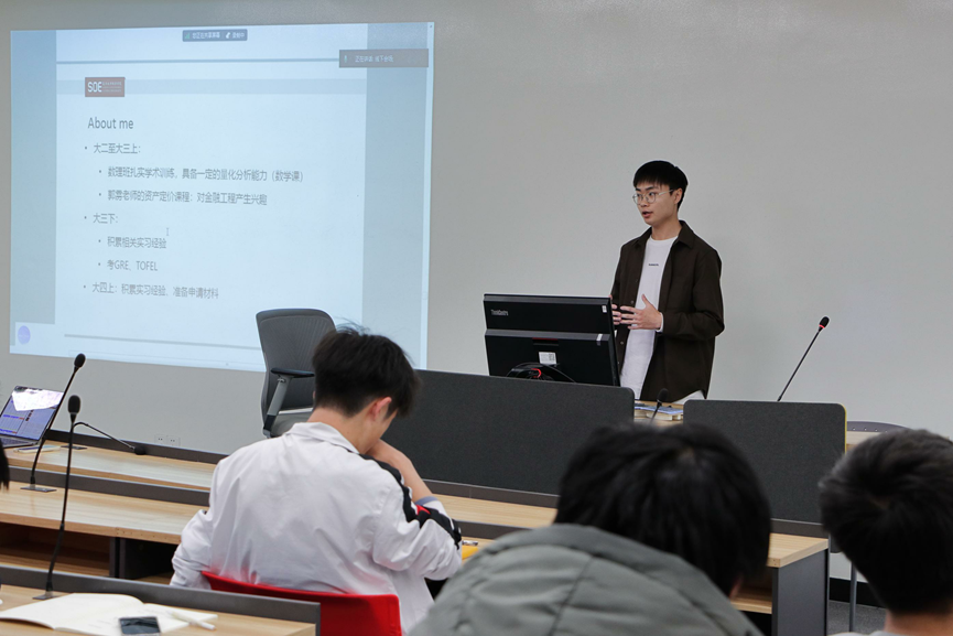 首先,关于保研。第一,出国和保研的选择方面,崔学长指出,不同国家和地区、不同学院的禀赋是不同的,比如在美国,从事量化方面的职业,由于当地的一个市场的规则,对于这份职业会更加友好。在国内,不一样的学院,禀赋可能也会不同,比如,复旦经院的中国经济研究就很厉害,北大光华在一些国内的一级市场,它的资源可能相对会更多。这一点可以通过不同学院的公众号、官网、一些第三方的公众号平台,或者是直接和学长学姐们交流了解。第二,个人背景方面,比如要考虑到自己对于家庭和之后职业方向的选择问题。每个人对于自己未来发展的方向的定义是不一样的,首先要认识自己,然后去找到自己到底想做什么,要在不断的尝试过程中去逐渐完善自己。第三,方向和学院概览方面,崔学长建议同学们提前做一个自己能申请到的院校的一个评估。那么怎么评估呢?就需要结合自己的学习成绩、标化成绩,以及交流经历、实习经历、科研经历,包括校内的活动和一些奖项情况等,进行多方面的综合考量。崔学长强调,做这些事情不仅仅是为了去满足申请要求,而是在做这些的过程中逐渐去充实自己,找到自己向往的未来方向,并基于此认清自己。第四,崔学长补充了申请时要注意的一些小的tips,指出可以关注申请项目的老师偏好什么类型的学生,并针对性地做准备;也可以关注相关的项目公众号和官网去规划申请的时间线。