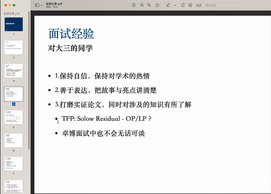 最后,张学长总结了一些忠告。第一,是要积极参加海外交流;第二,是要拥抱ChatGPT等新技术;第三,是了解中国经济;最后,是忠实于内心,兴趣是最好的驱动力。