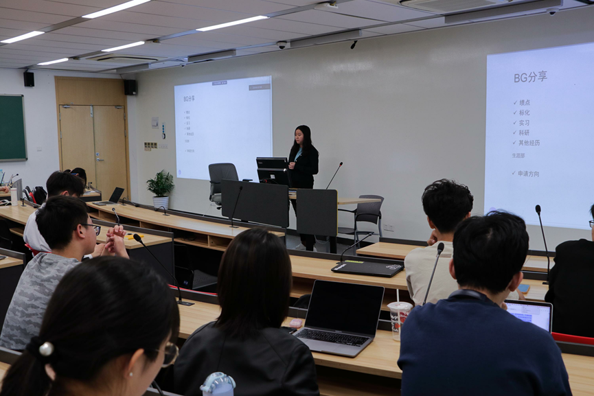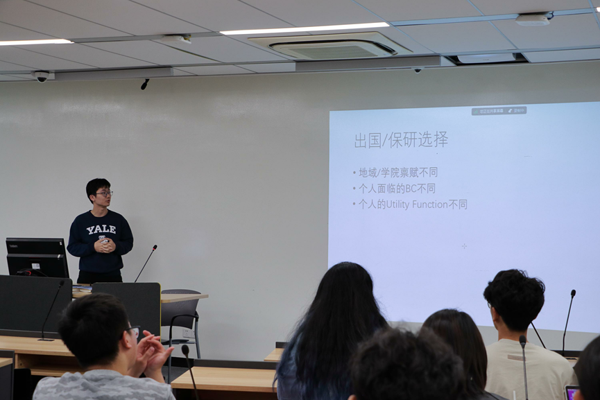 第四位分享嘉宾是崔怡昕学长,他以“国内保研、海外交流及路径选择”为主题,分享了国内保研、出国交换感受、路径选择和未来规划的有益经验。