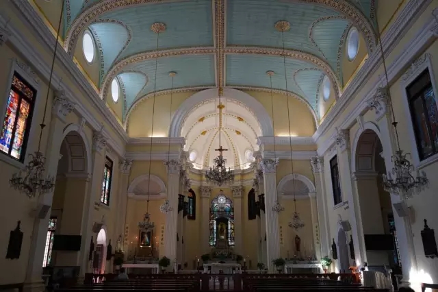 教堂门前有左右两排石梯级直达大门前,气派十足。教堂屋顶,是中国式的金字瓦面,堂内挂有古式吊灯,这是教堂引以为傲的装饰,堂皇肃穆,装饰充满东方色彩,古雅逸趣。