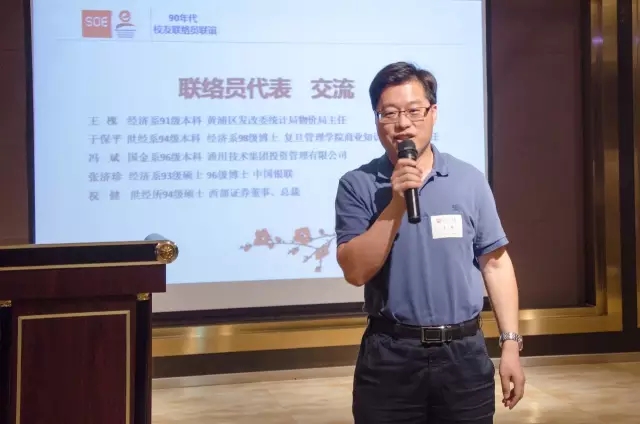 之后,来自不同年级、不同行业的五位联络员代表上台发言,分别是世经所94级硕士、西部证券董事、总裁祝健校友;经济系91级本科、黄浦区发改委统计物价局主任王槐校友;世经系94级本科、复旦大学管理学院商业知识传播中心主任于保平校友;国金系96级本科、来自通用技术集团投资管理有限公司的冯斌校友;经济系93级硕士、来自中国银联的张济珍校友,他们都表示了对复旦经院校友会工作的感谢和支持,并建议可以利用已搭建好的平台并将其品牌化,建立通讯册并规范制度,开展更加多层次、多方面的交流活动,让今后的校友联谊工作能做得更好。