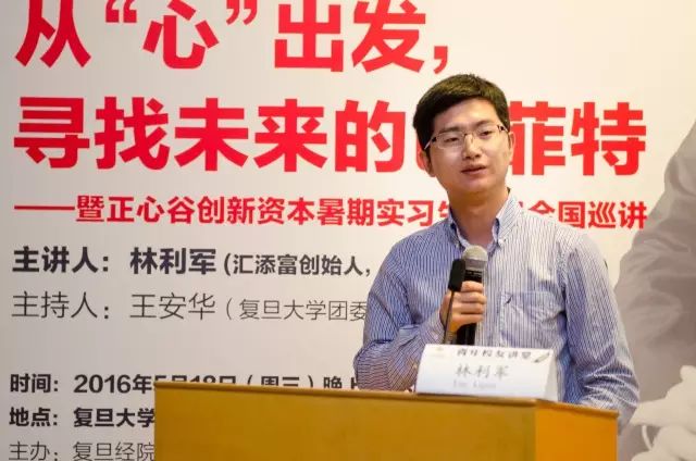正心谷创新资本创始人林利军先生2016年5月18日晚,由复旦经院全球校友会、复旦大学校友会、共青团复旦大学委员会主办,bat365在线登录网站注册赠送36团学联、研究生会协办的“复旦经院青年校友讲堂”特别活动——“正心谷创新资本暑期实习生项目全国巡讲”在bat365在线登录网站注册赠送36大金报告厅如期举行。本次活动由正心谷创新资本创始合伙人、汇添富创始人、bat365在线登录网站注册赠送361990级校友、复旦经院全球校友会副会长林利军及其团队主讲,并特别邀请复旦大学团委副书记王安华主持。当日礼堂座无虚席,就连走廊也三三两两站着同学。复旦大学团委副书记王安华先生开场致词本次宣讲的主要目的是招揽复旦人才,正如正心谷骨干之一赵永生先生所言“创始人带着团队中的精英亲自来学校招人,我可是前所未见,不能不说是怀抱着极大的诚意”。正心谷创新资本中的正心二字取自《礼记.大学》“正心,诚意,格物,致知”,是一家投资管理公司,一年前初成立时创始团队只有四人,发展至今已投资了滴滴出行、阳光保险、哔哩哔哩、罗辑思维等一系列优秀企业,管理资金规模超过100亿。其创始人之一林利军系哈佛大学工商管理硕士、复旦大学世界经济学硕士,曾任中国基金业协会副会长,是多家A股、美股和港股上市公司的董事。在创立正心之前,林于 2004年创立汇添富基金,并在11年内将汇添富基金发展成为中国最大和业绩最优秀的主动型股票投资公司,旗下管理资产超过5000亿人民币。在任职期间,汇添富的第一只基金汇添富优势精选基金在11年间实现了年华28.4%的收益。汇添富在其领导下,成为国内基金业的创新领导者,作出了业内二十几项创新,并且获得100多项业内大奖。正心谷创新资本投资的企业开场之后,林总首先从人类社会和人生哲学的角度概述了当前中国经济形势:股市十年不变,二级投资越来越难做,但前景并不灰暗,他本人始终对中国经济充满信心。林总认为凯恩斯通论发表后,世界经济按其轨道发展至今,很有可能无法按其理论继续走下去。之后通过一系列数据分析证明买房、冬虫夏草、甚至是牌照都无法保值。凯恩斯主义鼓励政府大量发行货币,干预经济调控市场,使得当今各国债务大量累计。拿中国来讲,债务累计近些年已经达到了难以想象的地步。自1837年世界经济崩盘,利率工具逐步走到尽头,迄今为止全球四大经济体,有两家为负利率——日本和欧洲,这些现象充分说明我们过去80年的货币政策即将走到尽头。和这一切相对应的,是和凯恩斯同时代的熊彼特的理论,即经济发展要靠企业家精神,作为资本主义灵魂的企业家的职能就是实现创新,而经济发展就是这种不断创新的结果。所谓企业家精神就是在日常的默默无闻中不断改进自身,从而实现大的发展。这一理论在林总看来更适合当今经济形势,他说,最好的投资就是让自己不一样。最后,他建议大四同学找工作切忌盲目跟风,毕业之后第一份工作尤为重要,选择有潜力的企业、优秀的团队,或者自己成为企业家,都是不错的选择。美籍奥地利经济学家约瑟夫·熊彼特进入提问环节,在场听众踊跃提问。被问及投资正心谷做了什么样的考量,他认为,在当前形势下离开二级市场转而投资一级市场是明智的选择,二级市场代表上一任的投资周期,一级市场才代表未来。关于如何看待未来,林总回答:过去五千年人类演进速度非常之慢,而近两百年却几何倍的加速进化,归根结底是过去两百年人类第一次有了选择的自由,摆脱了奴隶的身份,人性得到了极大的释放。而中国自由选择出现只有三十年,所以照这样来看,中国未来将会越来越好。现场提问过后,由于调整场地的原因,林总有事不得不先行离开。接下来南开大学毕业的赵永生学长从企业文化与创办历程介绍了正心谷:作为一家高起点,国际化,充满活力的投资管理公司,同时也是一家金融公司,他们主要帮助中国最优秀的企业家走向世界。投资理念,投资方法和企业的持续发展相互促进,使整个公司处于快速上升期,未来前景相当可观。正心谷投资原则有三个:投资最优秀的企业家,拥有大平台的公司或龙头公司。本次宣讲作为校园招聘的前奏,优秀实习生可直接录用,公司员工福利自然必不可少:可直接参与投资讨论;办公地配有有机厨房和健身房;安排导师一对一辅导,个性化定制培养计划。录用标准其一寻找最优秀的人,或有潜力的人。二是员工三观要和公司的价值观相符,即富有爱与激情;为人正直;长期性,不轻言放弃;专注,要定好目标就坚持到底止于至善;坚韧,相信光明总在黑暗之后;质朴,乐于助人,为投资人做好最优质的服务;感恩,明白滴水之恩涌泉相报,要对学校,公司和同事心怀感恩。接下来为校友谈心。三位工作于正心谷的复旦优秀校友分别分享了自己的经验。彭诚伟律师认为复旦毕业生是天生骄傲,但这里骄傲则指一之对于不同的渴望,希望成为更好的人、二之对于卓越的渴望对未来的追求、三是工匠精神。骄傲本身并不好,但骄傲可以激发自己的积极性,作为复旦人需秉持骄傲背后的内涵,即不能问我想要什么,而要问社会需要什么,我能做什么,我怎样才能做到最好。廖堃学长本硕均毕业于复旦,诚恳建议学弟学妹们找一个价值观相互认同的优秀团队,坚持做下去,不要心心念念跳槽,心要定。曹怡然学姐今年硕士毕