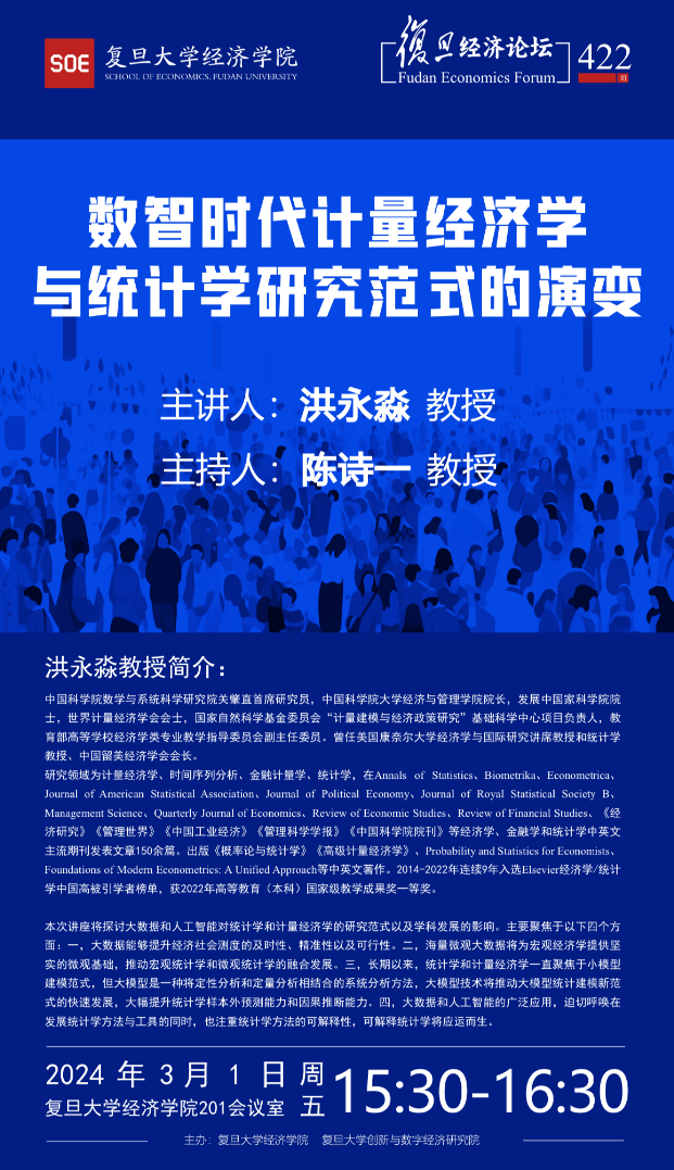 摘要:本次讲座将探讨大数据和人工智能对统计学和计量经济学的研究范式以及学科发展的影响。主要聚焦于以下四个方面:一,大数据能够提升经济社会测度的及时性、精准性以及可行性。二,海量微观大数据将为宏观经济学提供坚实的微观基础,推动宏观统计学和微观统计学的融合发展。三,长期以来,统计学和计量经济学一直聚焦于小模型建模范式,但大模型是一种将定性分析和定量分析相结合的系统分析方法,大模型技术将推动大模型统计建模新范式的快速发展,大幅提升统计学样本外预测能力和因果推断能力。四,大数据和人工智能的广泛应用,迫切呼唤在发展统计学方法与工具的同时,也注重统计学方法的可解释性,可解释统计学将应运而生。