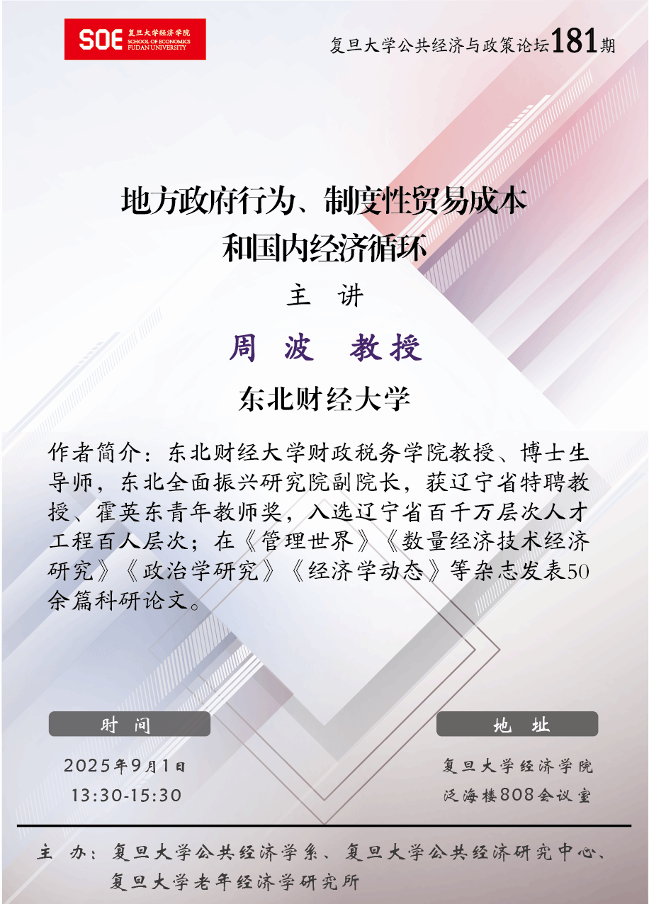 复旦大学公共经济与政策论坛181期:地方政府行为、制度性贸易成本和国内经济循环