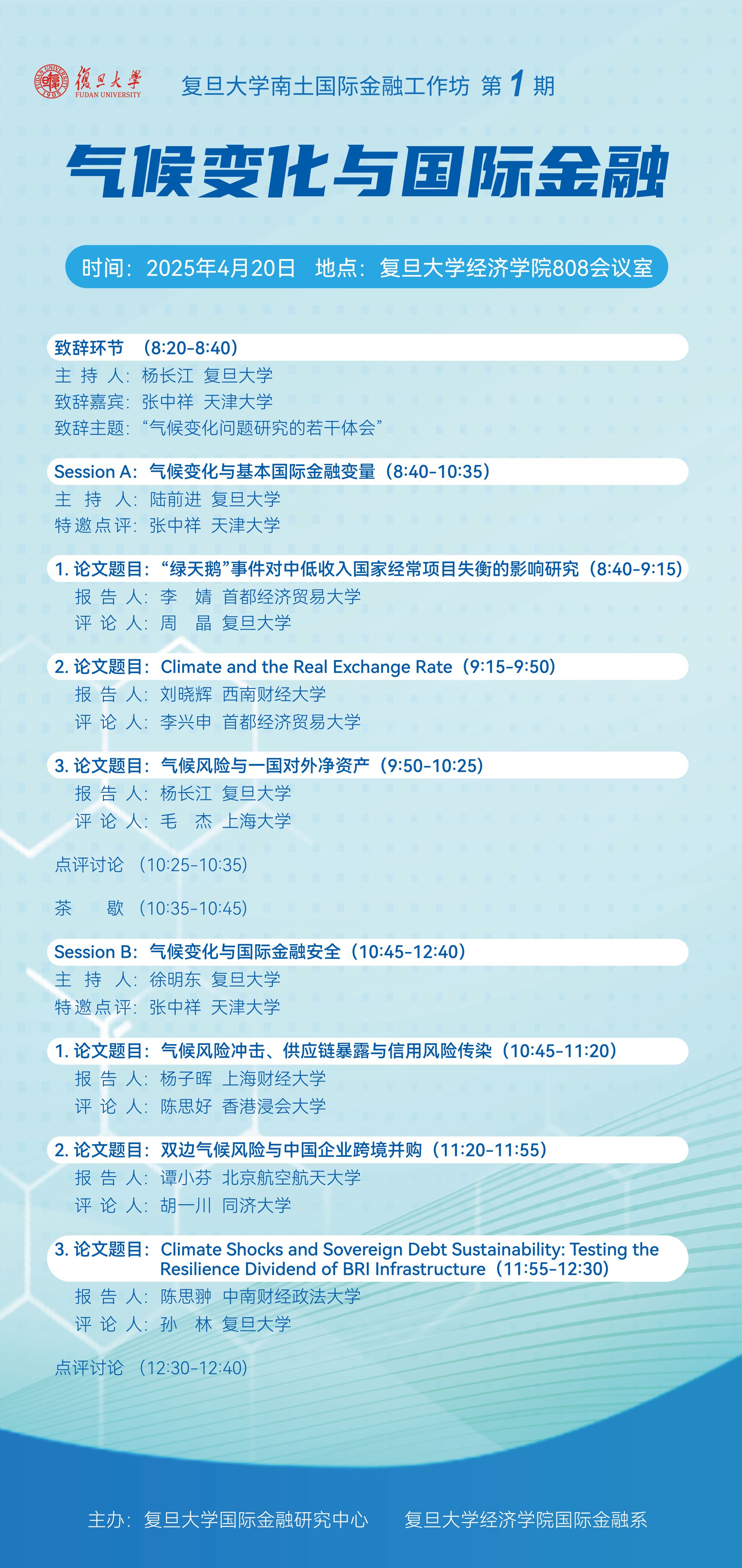 首期工作坊聚焦"气候变化与国际金融"这一重要议题,选取6篇学术论文,分设两个专题板块进行研讨,并特邀著名环境经济学家张中祥教授担任致辞及点评嘉宾,以期通过跨学科对话来推动这一新兴交叉领域的研究创新。