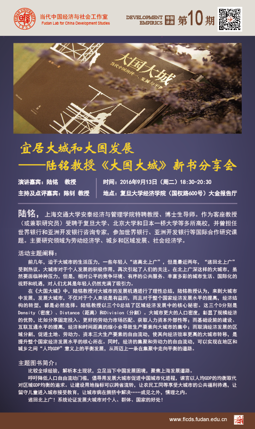 在《大国大城》中,陆铭教授对大城市的发展机遇进行了理性总结,陆铭教授认为,来到大城市中发展,发展大城市,不仅对于个人来说是有益的,而且对于整个国家经济发展水平的提高,经济结构的转型,都是必然选择。陆铭教授以三个D总结了区域经济发展中的核心秘密。这三个D分别是Density(密度)、Distance(距离)和Division(分割)。大城市更大的人口密度,彰显了规模经济的优势,比如分享固定投入、更好的劳动力市场匹配、获取人力资本外部性等;而基础设施的建设、互联互通水平的提高,经济和时间距离的缩小会导致生产要素向大城市的集中;而取消经济发展的区域分割,促进土地、劳动力、资本三大生产要素的自由流动,使其向经济效率更高的大城市转移,是提升整个国家经济发展水平的核心所在。同时,经济的集聚和劳动力的自由流动,可以实现在地区和城乡之间“人均GDP”意义上的平衡发展,从而迈上一条在集聚中走向平衡的道路。