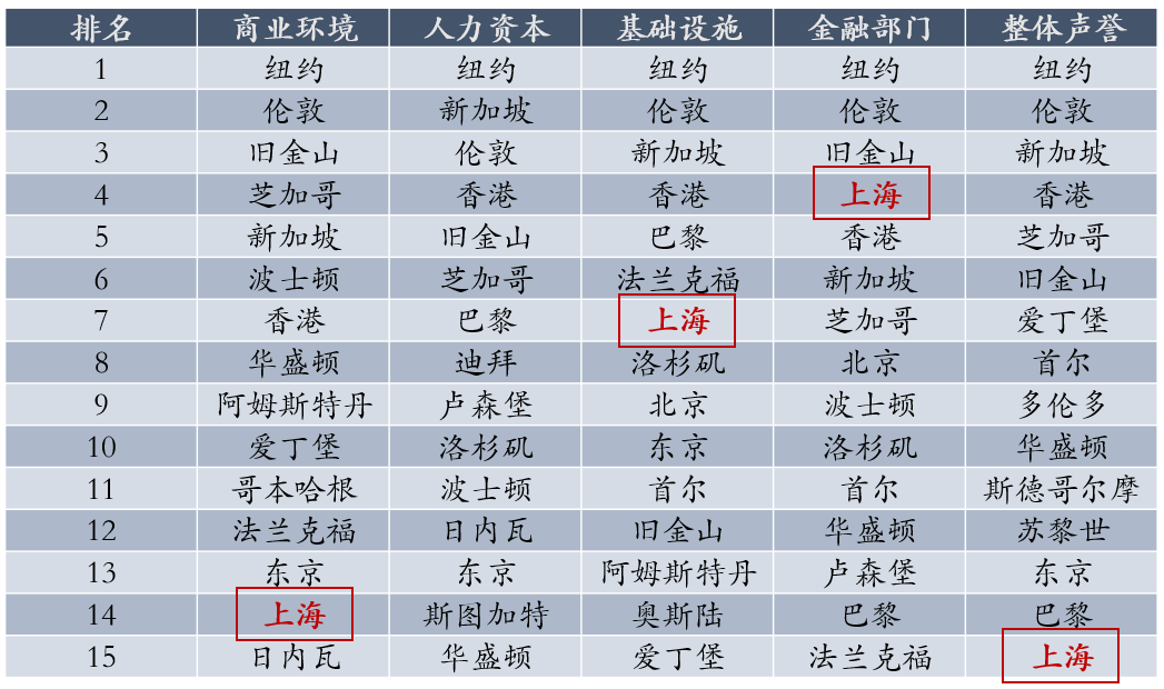表1 竞争力评价体系分类排名前15位的国际金融中心
