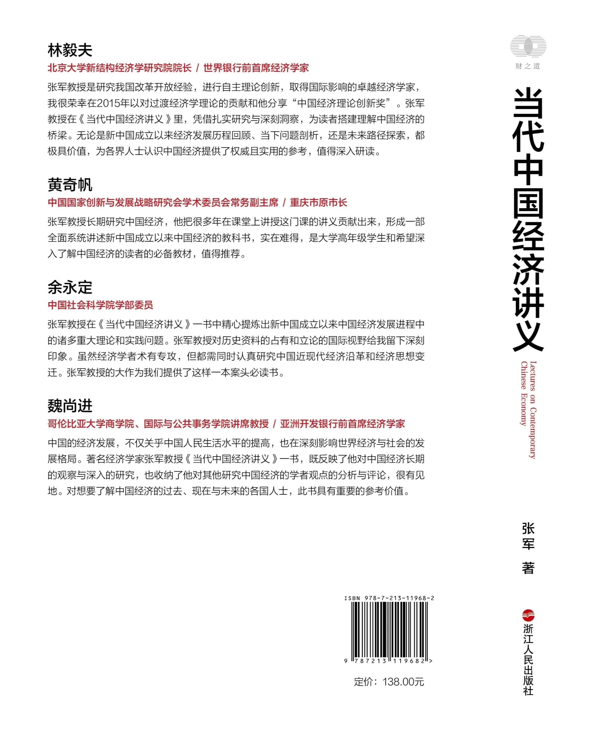 林毅夫(北京大学新结构经济学研究院院长)推荐语:张军教授是研究我国改革开放经验,进行自主理论创新,取得国际影响的卓越经济学家,我很荣幸在2015 年以对过渡经济学理论的贡献和他分享“中国经济理论创新奖”。张军教授在《当代中国经济讲义》里,凭借扎实研究与深刻洞察,为读者搭建理解中国经济的桥梁。无论是建国以来经济发展历程回顾、当下问题剖析,还是未来路径探索,都极具价值,为各界人士认识中国经济提供权威且实用的参考,值得深入研读。