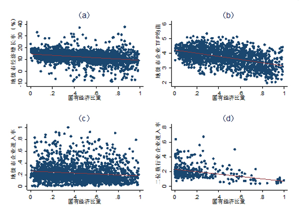 从图中不难发现,国有经济比重与经济增长率、企业平均全要素生产率以及企业市场进入均存在明显的负相关关系。平均来说,国有经济比重高的城市,经济增长速度相对较慢,经济运行效率也较低(见图3a和图3b);国有经济比重高的城市或行业,新企业进入市场的难度也相对高(见图3c和图3d)。