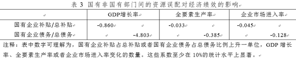 本文基于理论模型测算出国有与非国有部门之间资源误配对产出、全要素生产率以及企业市场进入率等主要经济绩效指标的影响,并将结果报告在表2之中。