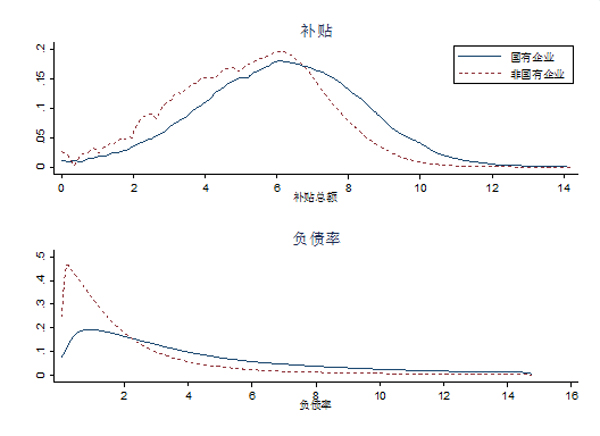 为进一步说明非国有部门面临着更多扭曲,图2展示了国有与非国有企业在政府补贴、负债率方面的差异。从图形中可以发现,与国有企业相比,非国有企业所获取的政府补贴数额较少(上图),这表明政府更倾向于补贴国有企业;非国有企业负债额显著低于国有企业(下图),由于负债是企业融资能力的外在体现,负债越高说明其获取外部融资的能力越强,由此可见,非国有企业面临更大的融资压力。
