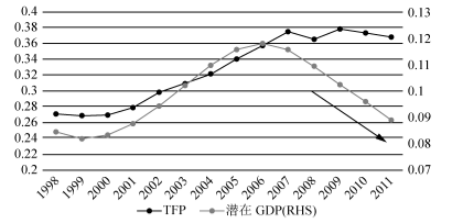 资产负债扩张对于潜在GDP增长和全要素生产率(TFP)的影响分为两个阶段。第一阶段:实体经济中的资产和负债扩张具有“挤入”效应。中国的TFP和潜在GDP增长率同时上升。第二阶段:实体经济中的资产和负债扩张具有“挤出”效应。中国的TFP增长较缓慢,而潜在GDP增长率则显著下降(见图8)。