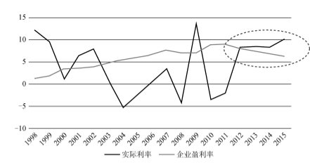 转折点是2008年全球金融危机后,政府出台的4万亿人民币财政刺激政策。由于预算软约束的存在和资产泡沫的持续发展,地方政府、国有企业和房地产企业的投资和融资决策均对利率不敏感(见图6)。这一阶段融资体系出现传统信贷向“影子银行”的模式转变。实体利率高于工业企业盈利率(见图7),导致诸多资金从实体经济涌入金融市场和房地产市场。在中国人口红利下降的背景下实体经济的回报进一步下降,产业结构发展扭曲,要素配置效率低下及全球经济增长态势萎靡。