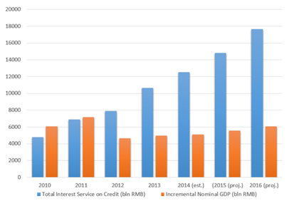 而且,中国GDP的增速并不是慢慢放缓的,放缓其实是非常快的。之前,中国决策者所能容忍的最低经济增速是8%,但在2012年之后,经济增速已经低于8%了;同样从2012年开始,债务的利息偿付已经高于名义GDP的增长额了,这意味着整个经济的增长量远小于债务利息的增长量(见图1)。