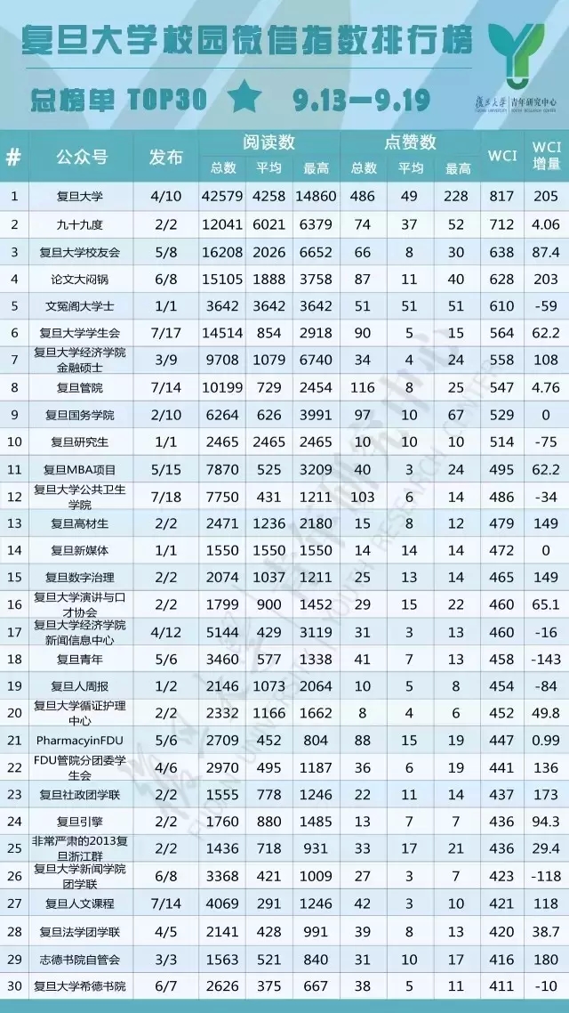 过去的一周里,复旦校园里,微信公众号哪家强?复旦大学青年研究中心的制作团队给出了答案。