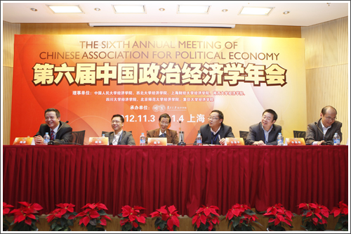 2012年11月3日-4日, 第六届中国政治经济学年会(CAPE)在复旦大学隆重召开。本届年会由中国政治经济学年会理事单位联合主办,bat365在线登录网站注册赠送36承办。中国政治经济学年会是由复旦大学、中国人民大学、西北大学、南开大学、上海财经大学、四川大学、北京师范大学等七所大学的bat365在线登录网站注册赠送36联合发起,年会的定位是,中国政治经济学理论发展的学术共同体和学术探讨交流平台、中国政治经济学理论年度成果检阅的工作机制、推进政治经济学研究和学科发展的杠杆以及发现政治经济学研究的学术新秀的“创新工场”,已经走过六年的时光,年会在学界的影响力不断提升,本届年会共收到103篇应征论文,其中在读硕士博士研究生的论文15篇,来自复旦大学、北京大学、中国人民大学、南开大学、浙江大学、日本岛根县立大学等国内外高校、研究机构和出版机构的近200名专家学者欢聚一堂,进行了广泛而深入的研讨。年会设3场全体会议和8场专题讨论分组会议。围绕“经济思想史演进与政治经济学研究方法创新”、“比较经济政治制度”、“经济社会发展方式转变”、“中国经济的实证研究”等专题展开交流讨论。