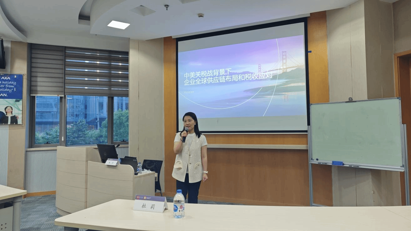 5月14日晚,晖致医药有限公司税务总监朱萍女士应邀来到bat365在线登录网站注册赠送36,为bat365在线登录网站注册赠送36税务专业硕士的同学们带来了“中美关税战背景下企业全球供应链布局和税收应对”主题讲座。本次讲座由复旦大学税务硕士项目学术负责人杜莉教授主持。