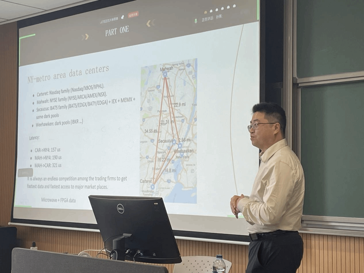 首先,段老师从美国股票市场结构谈起,指出其最大的特点是“市场碎片化”。与中国仅有上交所和深交所不同,美国股票可在多达13个交易所同时交易,此外还存在暗池等不公开交易场所,部分交易信息甚至不体现在市场数据中。这种碎片化结构对量化交易提出了更高的数据整合与延迟控制要求。此外,段老师还介绍了美国电子化交易的发展历程,以及主要数据中心的地理分布,强调不同数据中心之间存在延迟差异,进而产生套利机会。