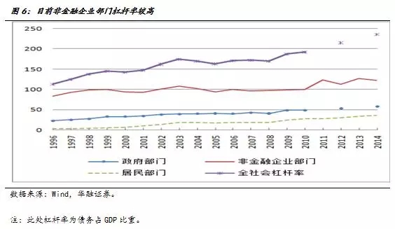 一是全社会杠杆率呈现明显的上升趋势。2014年居民部门杠杆率水平36.4%,比2008年高100%;非金融企业部门123.1%,比2008年上升25.1个百分点;政府部门为57.8%,比2008年提高16.8个百分点;总债务水平达235.7%,比2008年提高65.7个百分点(图6)。居民部门的杠杆率提高速度是非常快,非金融企业部门的杠杆率则是全球主要经济体中最高的。2015以来,该趋势似乎并没有明显改变的迹象。