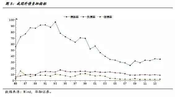 其次,外债负担较轻,远低于亚洲金融危机时期。1998年,中国外债债务率为70.4%,外债负债率为14.3%,外债偿债率为10.9%,而2014年已经分别下降到35.2%、8.6%、1.9%。