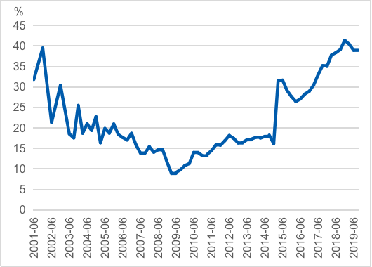 虽然中央政府的债务率(即国债占GDP的比率)仍处于健康水平(2018年底为37%,图5),但考虑到中央政府对地方政府各种形式的债务的隐性担保,整体政府债务率已经不低,这也是为什么过去几年三大攻坚战中的首要任务“降杠杆、防风险”中的重点之一就是控制地方政府债务。同样,鉴于家庭、企业与金融部门的整体杠杆率过去十年已大幅度攀升(从2008年底的147%上升到2018年底的268%,图5),通过货币与信贷政策放松来加杠杆、刺激需求的空间也非常有限。如果决策部门执意通过加杠杆来刺激需求的话,很可能会令过去几年“降杠杆、防风险”的成就前功尽弃,加大中国金融体系的风险,并透支未来中国经济可持续增长的空间。