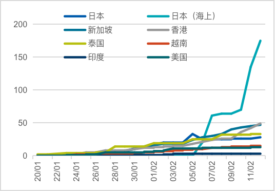 4.从海外数据来看,确诊病例还在攀升之中(图3)。鉴于绝大部分海外地区并未采取中国式的社区隔离等防控方法,其传染途径并没有有效切断。考虑到从武汉发现首例病例(2019年12月上旬)到出现大范围病例(2020年1月中旬)的间隔大概有4-5周时间,海外病例是否也会经历这样一个漫长的潜伏与累积过程尚需观察。鉴于此病毒传染性极强,如果疫情在海外(尤其是医疗条件较差的发展中经济体)出现扩散,即便疫情在中国得到控制,也不能排除未来疫情有重新从海外输入的可能性。