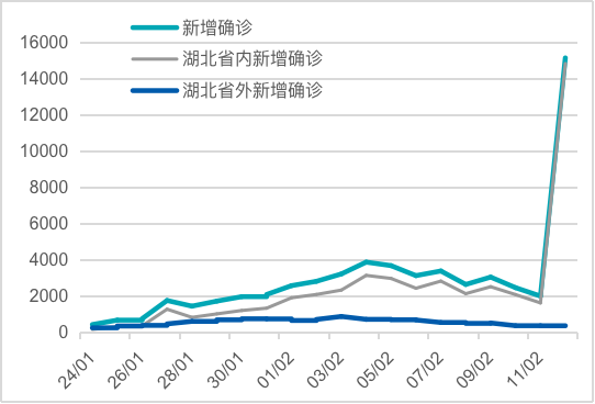 根据国家卫生健康委员会每日公布的数据,全国新增确诊的新冠病毒肺炎病例人数自2月4日见顶后已呈现下滑趋势(2月12日的大幅度反弹是由于统计分类方法的改变所做的一次性调整;图1),新增疑似病例自2月5日见顶后也明显下降,而湖北省外的新增确诊病例更是自2月3日以后就一路走低(图2)。这表明,包括武汉在内的各地区所采取的严厉的隔离政策已初见成效,令人鼓舞。