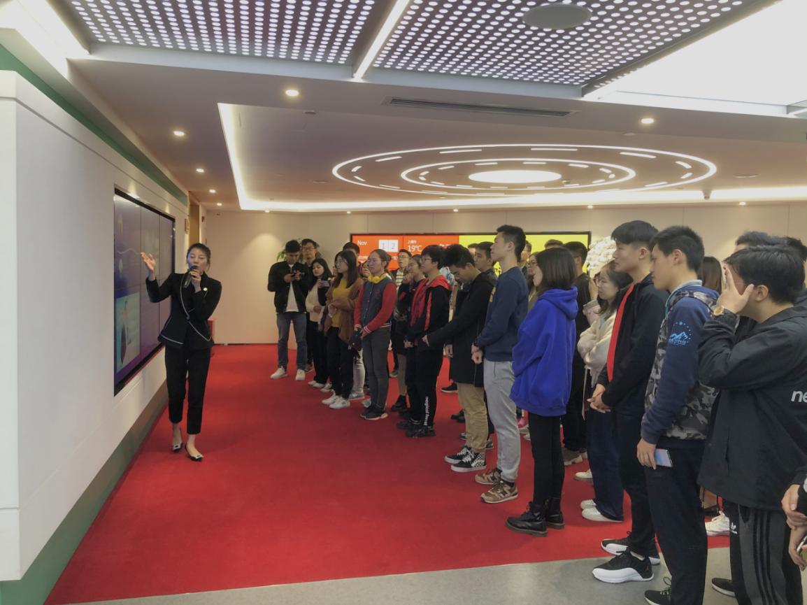 紧接着,同学们在工作人员的带领下参观了办公区和休闲区,零距离感受了美团点评的工作环境和员工们的工作、生活状态。参观完工作区后,大家进行了热烈的交流座谈,上海总部的商务分析负责人结合自己的工作经验,以资深员工的角度深入分享了自己对美团企业精神的理解。他的总结是对之前讲解员讲解内容的深化,更加细致地向同学们介绍了“业务”和“四大事业群”等内容,其生动具体的介绍引起会场的阵阵欢笑和掌声。