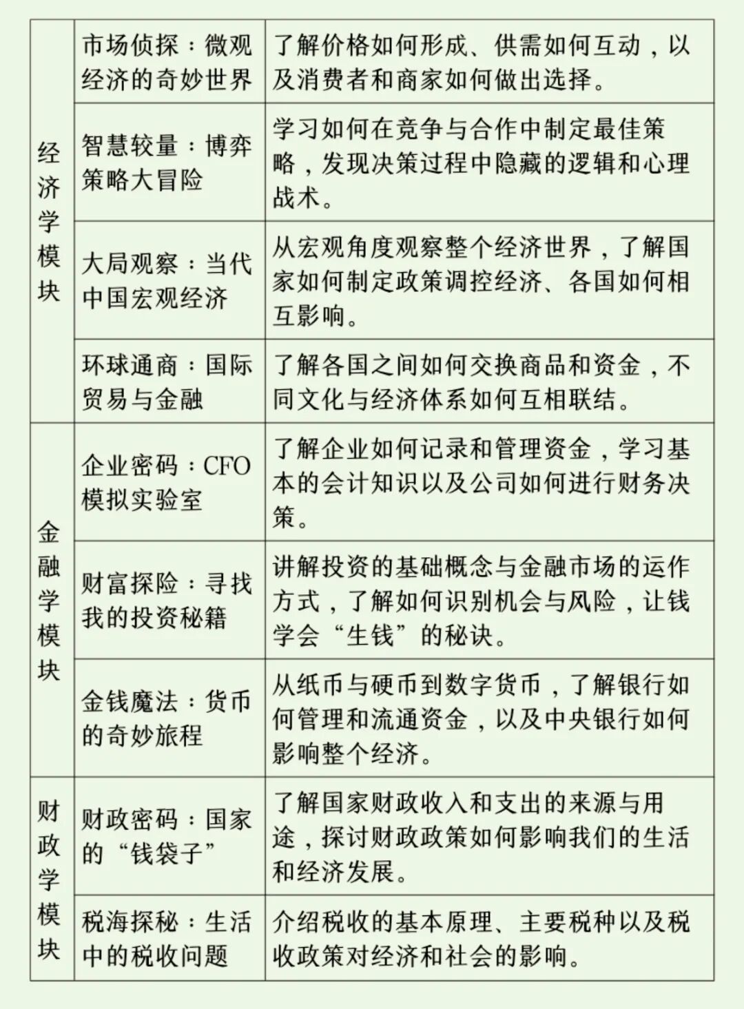 基础拓展类课程:物理、地理、趣味数学、心理、生理健康、趣味经济学、音乐、手工等