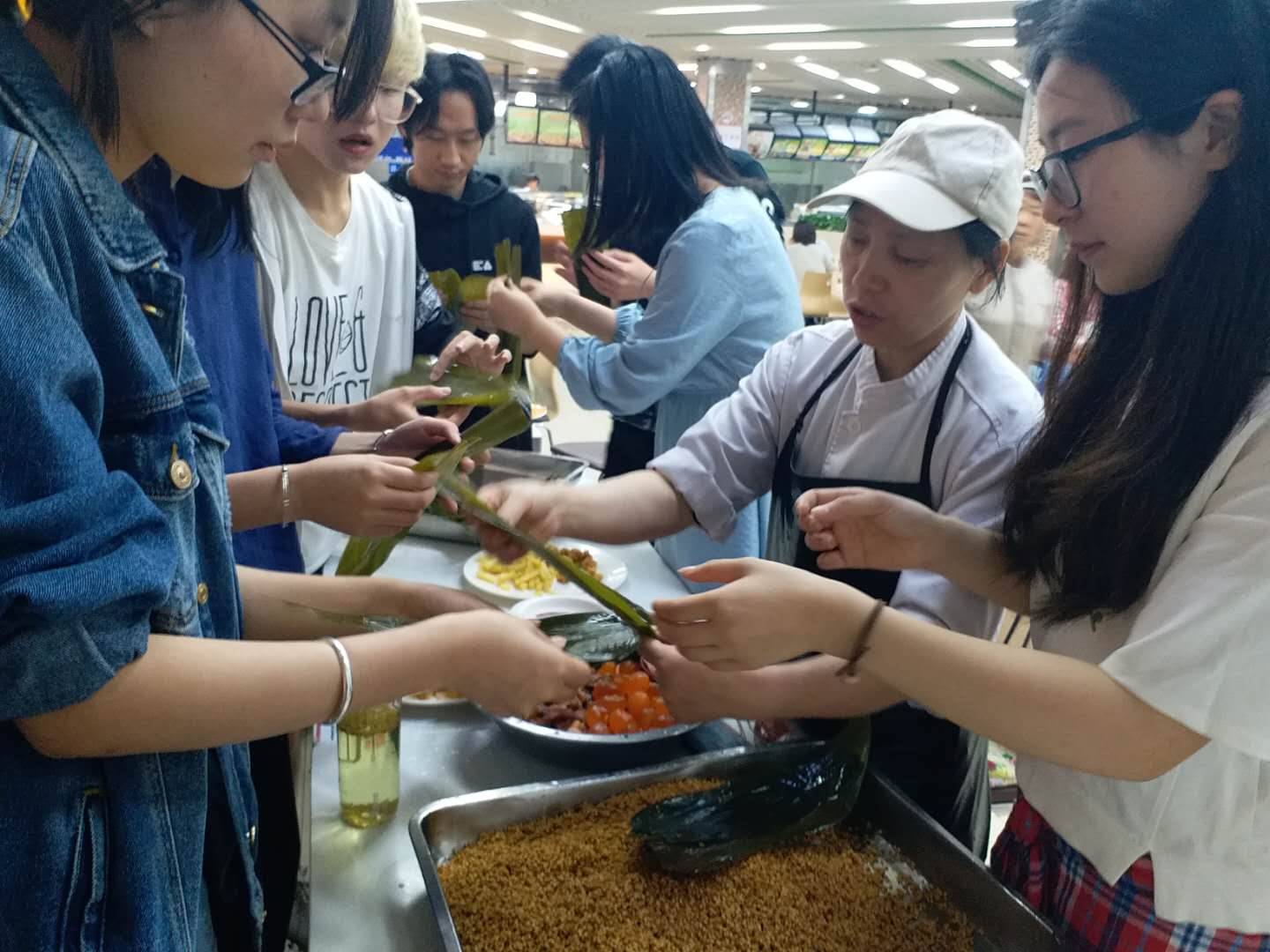 随后,同学们陆续到达了目的地,食堂阿姨开始了包粽子教学活动。只见阿姨拿起两片粽叶,灵巧地叠成漏斗状,加入米和填充料,紧接着拿起彩色的绳子“五花大绑”,一个漂亮的粽子就完成了!随后,同学们照葫芦画瓢,开工了。经历了不知道如何以及漏米粽子等危机后,50个粽子横空出世!粽子下锅期间,为了让同学们拥有更好的活动体验,文艺委员还策划了制作蛋挞的环节。考虑到时间的因素,负责采购的同学直接购买了蛋挞皮和蛋挞液,便于同学们简单加工。