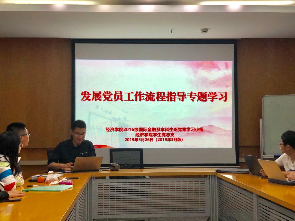 5月26日晚,2016级国际金融系本科生班党章学习小组在bat365在线登录网站注册赠送36泛海楼614会议室,开展发展党员工作流程指导专题学习,党章学习小组指导老师澹台文赟主持了此次专项学习。让同学们对发展党员工作流程有了更加清晰、深刻的了解。