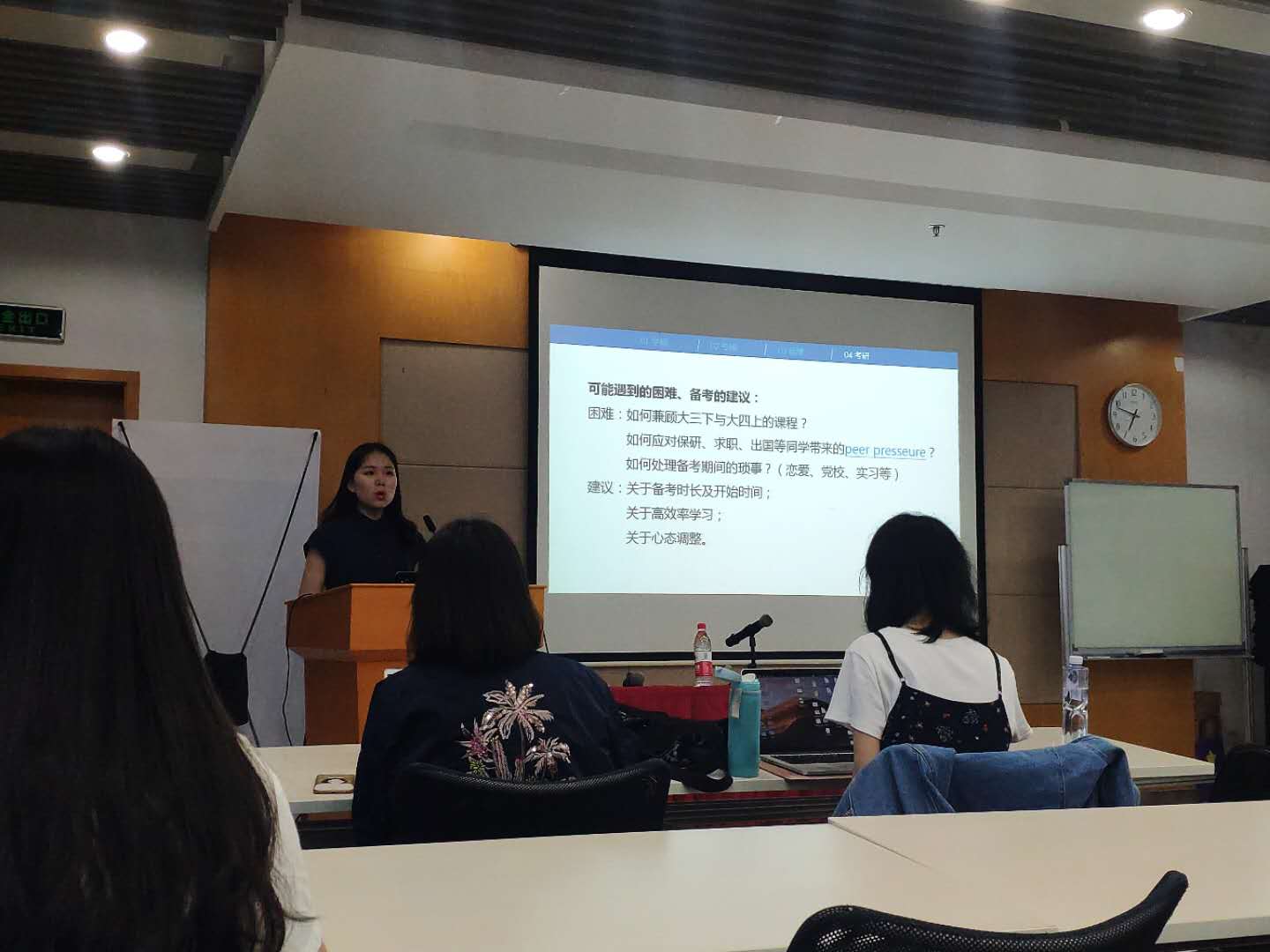 接下来由金霜莹学姐讲述了复旦经院本校保研的那些事。金学姐列出了经院保研人数和推免的最低绩点。同时学姐也指出保研除了计划的名额还有很多种方式,可以选择考虑夏令营、人才工程、研究生支教团和参军返校等等。找到最合适自己的那条道路才最重要。之后,学姐还介绍了面试的内容,面试老师主要会对专业知识提问,同时也会考察对时事的理解。学姐提醒大家在保研面试前的那个暑假可以复习一遍专业课知识。