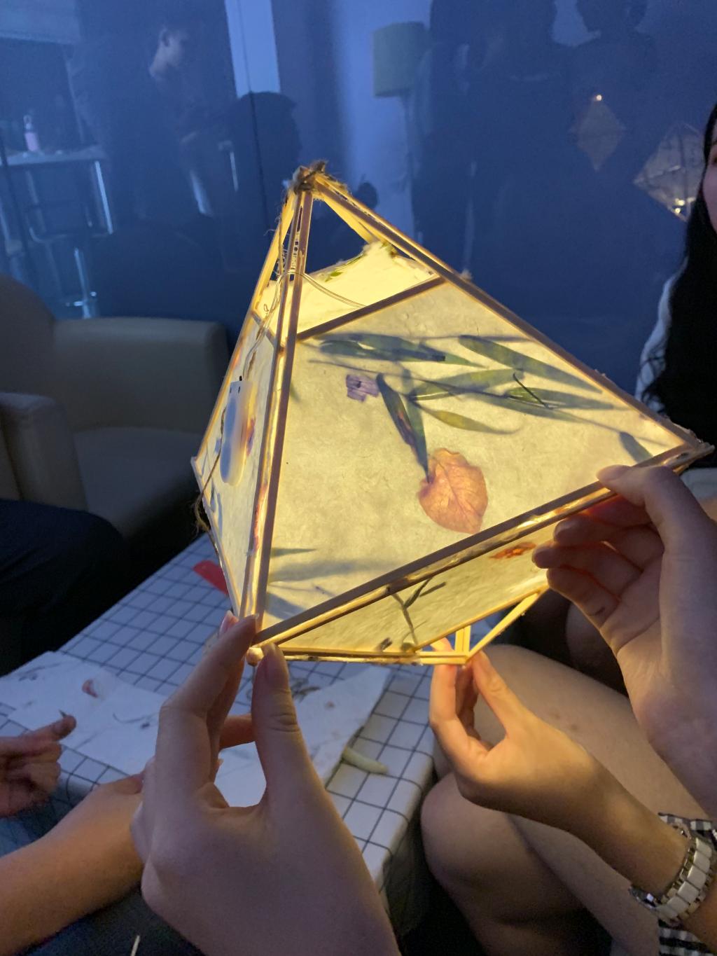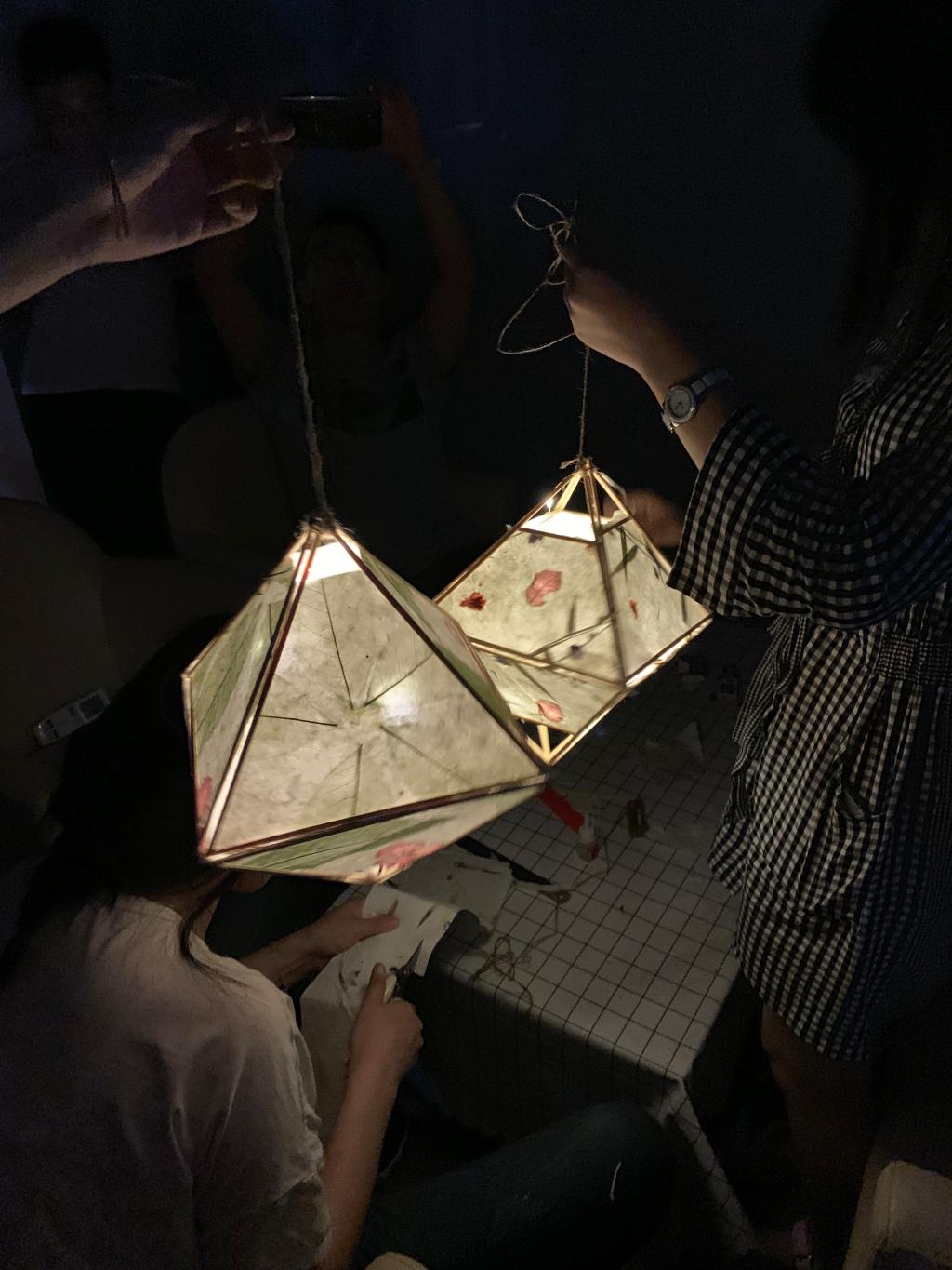 在班级制作花灯环节,班级成员以联谊寝室为基本单位,并根据实际情况调整具体学生安排,以若干名同学为小组的形式,将班级提前购置的花灯拼装成型。同学们经过自行钻研、大胆尝试、网上资源搜索与相互交流等形式,研究花灯的拼装方法并制定花灯的拼装策略和步骤。在拼装制作的过程中,同学们制作分工明确,通过个人的精细操作、小组内部的相互合作和小组之间的互帮互助讨教经验,班级的花灯一一成型。同学们看见自己亲手制作的花灯的光明激动不已,三两成群地与花灯合照。放入灯帘的花灯在中秋之夜展现出别样的明亮,花灯的背后是同学们的热情和倾注。