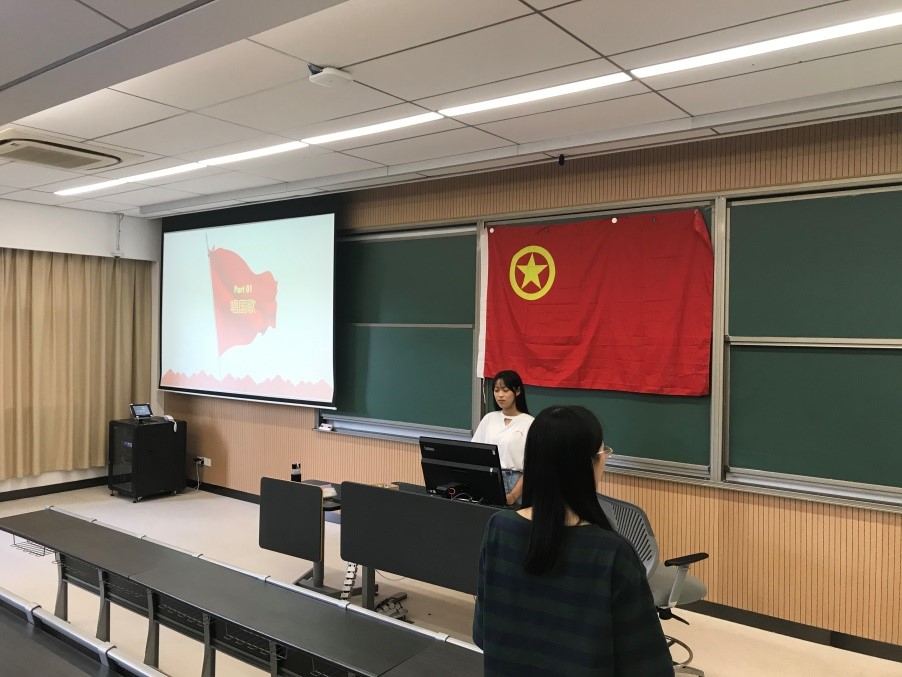 活动共分为五个部分——1.唱国歌2.观看《旗帜》第3集《建国创业》视频3.团支书王雨玲同学为大家上团课4.合唱《我和我的祖国》5.唱团歌