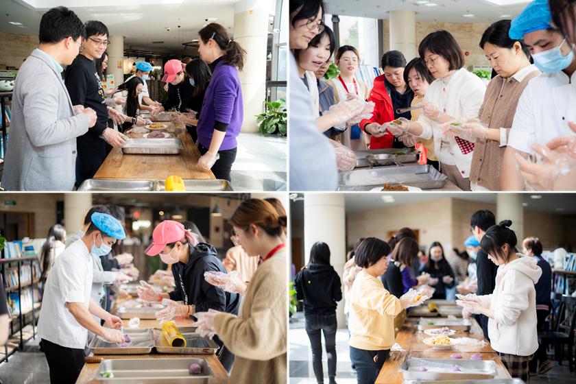 随后,教职工们共同制作了青团,体验了传统美食的制作过程,品尝了春天的味道。本次活动我们一共准备了豆沙、蔓越莓、咸蛋黄等四种馅料,每位老师根据个人口味,挑选了自己喜爱的馅料。老师们一边制作传统美食,一边说笑谈天,气氛温暖且融洽,正如制作青团不仅是对传统文化的传承,更是对团圆与温暖的寄托,每位老师都享受着这个特别的时刻。
