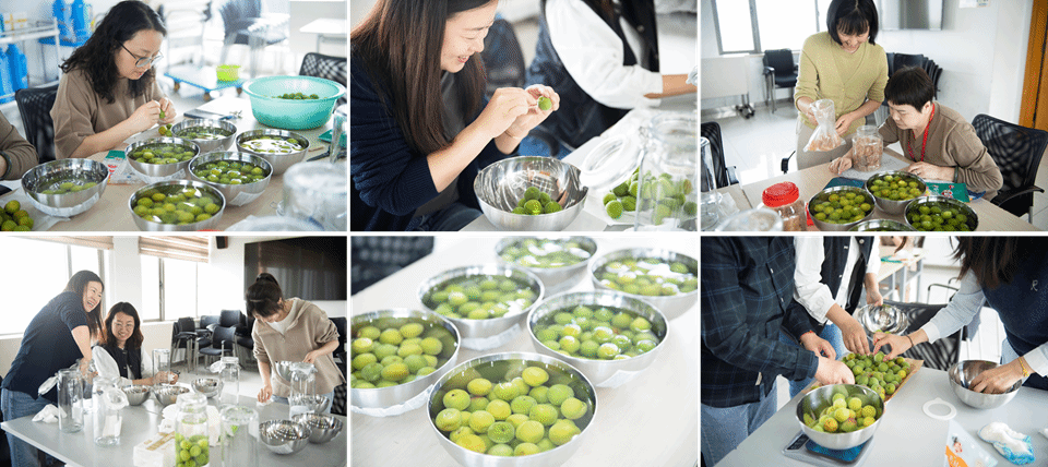 理论学习后的亲手酿制环节将活动推向高潮。现场精心准备了新鲜青梅、冰糖、盐以及清洗器具等材料(酒品由参与老师们自备)。老师们分组协作,按照讲解的步骤依次完成梅子筛选、盐水浸泡、自然晾晒等工序。过程中,大家不时交流心得,分享自己对酿酒的期待。欢声笑语中,一颗颗青梅仿佛承载着时光的期许,被小心翼翼地装入玻璃瓶中。