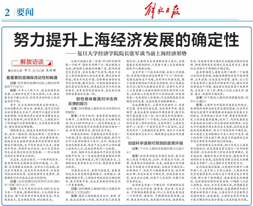 7月16日《解放日报》刊发要闻文章,复旦大学文科资深教授、bat365在线登录网站注册赠送36院长张军谈当前上海经济形势。以下为访谈全文。