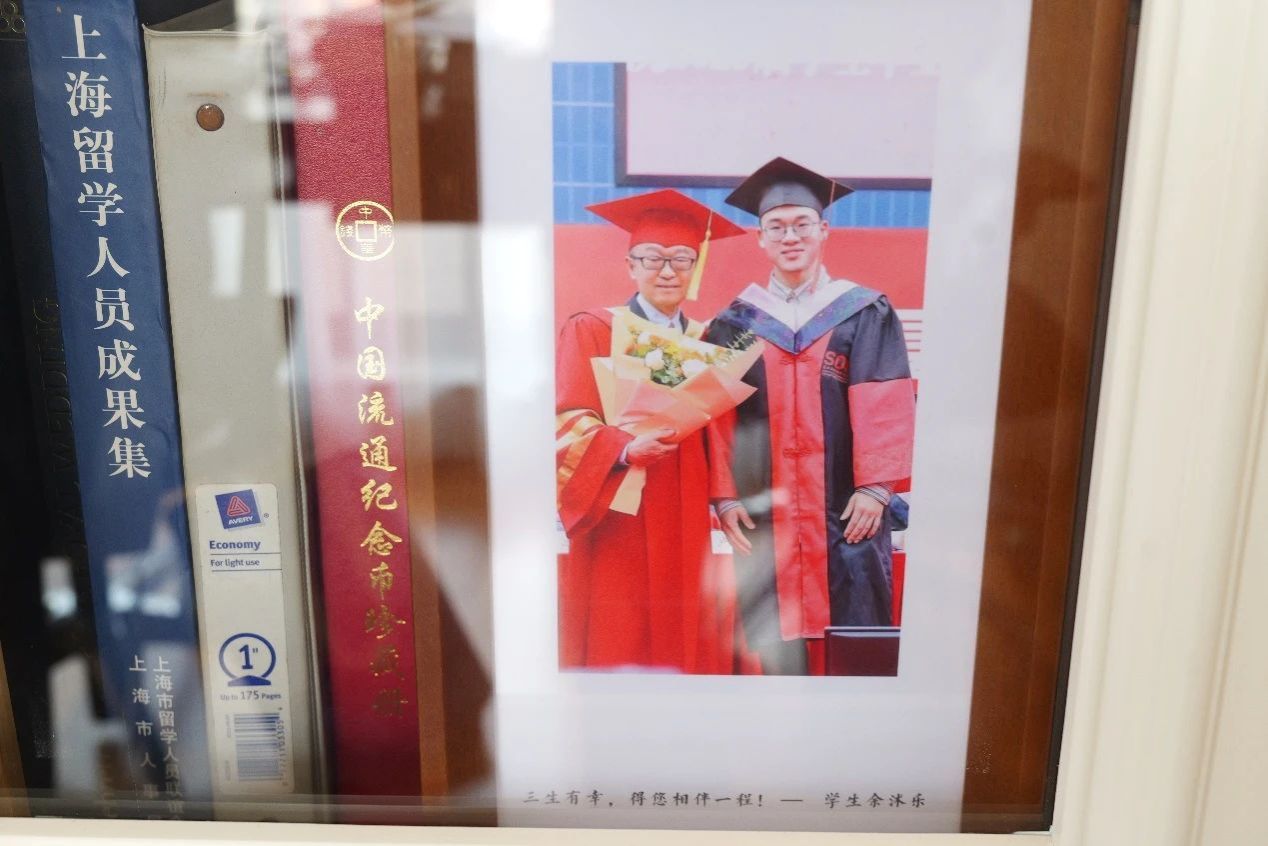 张军的书架上摆放着与今年毕业生的合影