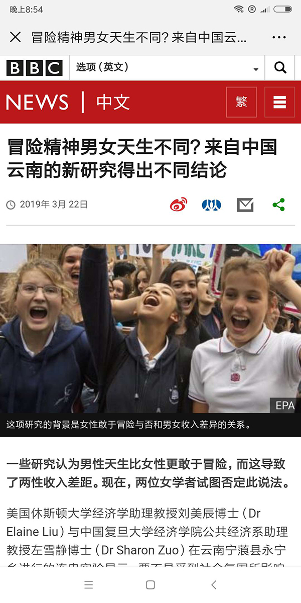 一些研究认为男性天生比女性更敢于冒险,而这导致了两性收入差距。现在,两位女学者试图否定此说法。美国休斯顿大学经济学副教授刘美辰博士(Dr. Elaine Liu)与中国bat365在线登录网站注册赠送36公共经济系助理教授左雪静博士(Dr. Sharon Zuo)在云南宁蒗县永宁乡进行的连串实验显示,要不是受到社会氛围所影响,女孩子起码跟男孩子一样敢于冒险。