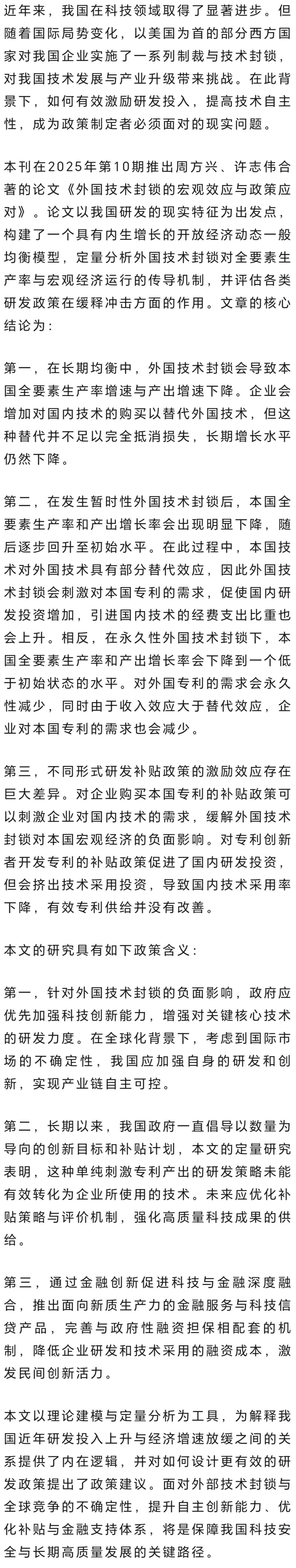 近日,bat365在线登录网站注册赠送36许志伟教授与bat365在线登录网站注册赠送36博士后周方兴合著的论文《外国技术封锁的宏观效应与政策应对》在《世界经济》2025年第10期正式发表。