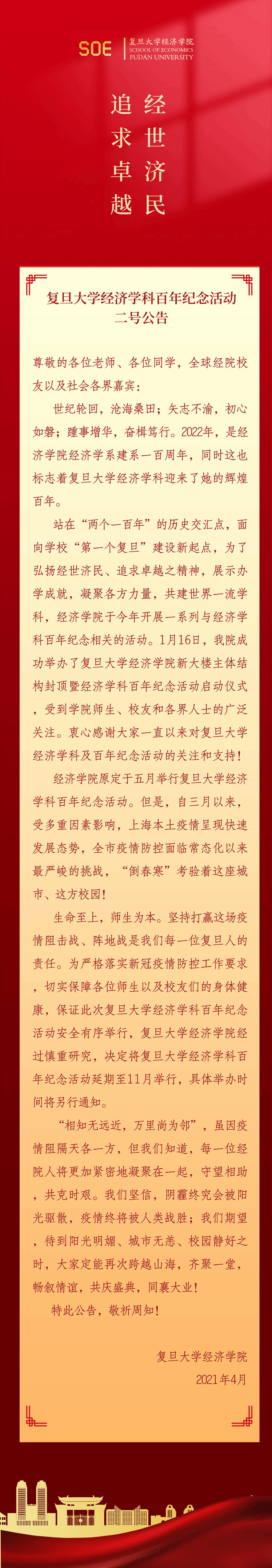 学科百年文章征集:1.我与复旦百年经济学科的故事。2.我所熟悉的复旦经济学科的前辈鸿儒。3.复旦大学经济学科百年专文献语。提倡选材精炼、简洁,文章以2000至4000字为宜,如能提供配套图片与图片说明为佳,以上题目仅供参考。专文献语以100字以内为佳,通过一句简洁话语,或诉说回忆,或表达祝愿。