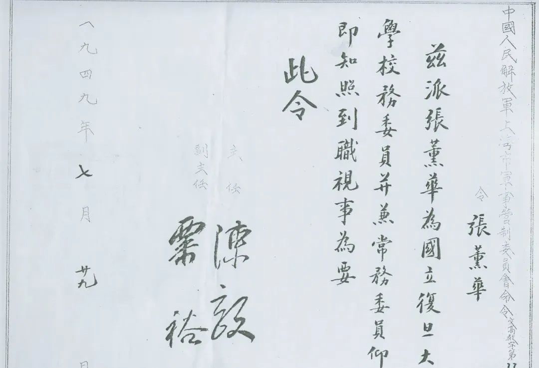 1949年7月29日,中国人民解放军上海市军管会主任陈毅、副主任粟裕签署的张薰华任复旦大学校务委员会委员兼常务委员的委任书