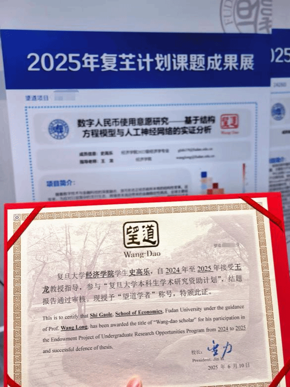 在2024年春季学期(大二下)时,我独立申请并主持了“复芏计划”望道项目。我运用经济学和机器学习相结合的方法,完成了一项数字经济领域的研究。这个项目立项和结项都获得了“优秀”的评级,2025年春季学期结项前,也由学校推荐获得了国家级大学生创新创业训练计划的支持。望道项目的学术经历对我帮助很大。因为完成项目涉及到立项书撰写、中期报告答辩、结项书撰写、财务报销等等全流程的工作,这些锻炼对于后续主持其他研究项目而言,是非常宝贵的经验。